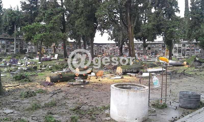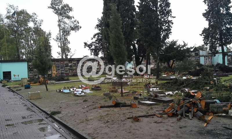 (Dolores). Personal de la Intendencia de Soriano viene trabajando en la limpieza del cementerio doloreño, que también resultara afectado por el tornado del viernes 15 de abril. Caída de varios árboles y voladura de chapas fueron los principales daños de la necrópolis tras el fenómeno meteorológico que azotara a esta ciudad.