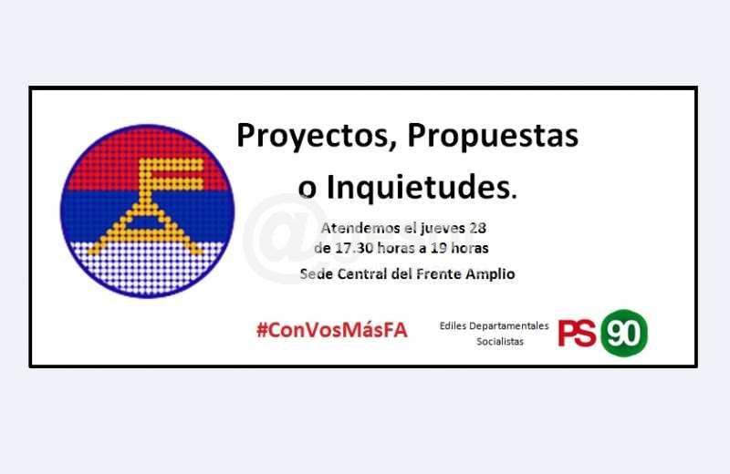 Este jueves 28 , de 17.30 a 19 horas en la sede Central del Frente Amplio, los ediles socialistas estarán atendiendo al público en general, recibiendo propuestas, proyectos o inquietudes.