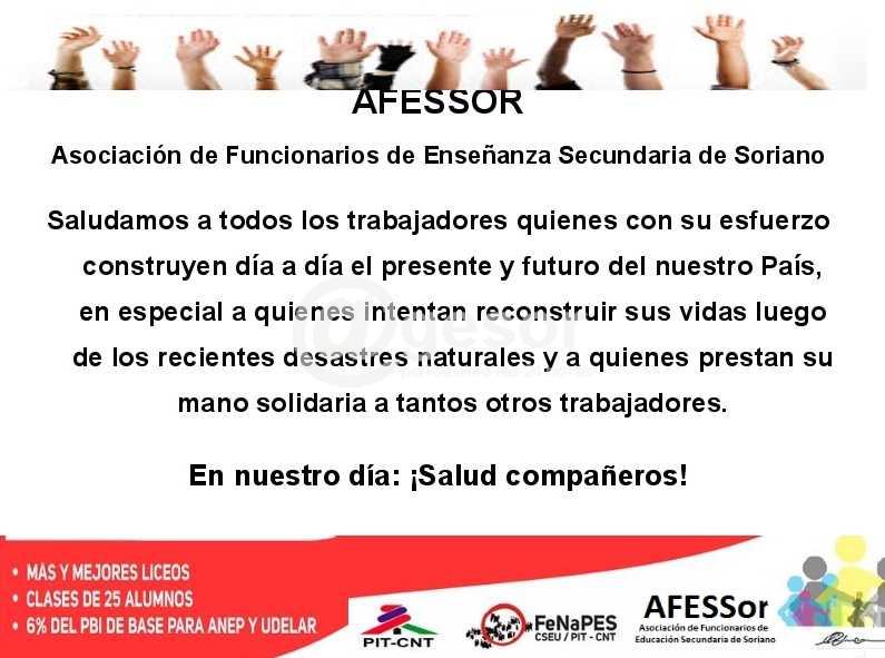 Saludamos a todos los trabajadores quienes con su esfuerzo construyen día a día el presente y futuro de nuestro país, en especial a quienes intentan reconstruir sus vidas luego de los recientes desastres naturales y a quienes prestan su mano solidaria a tantos otros trabajadores.