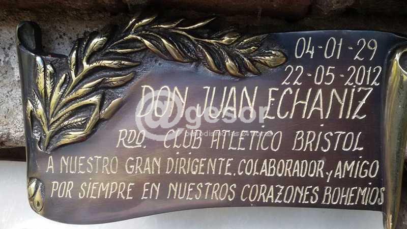 Con motivo de cumplirse este domingo 22 de mayo el cuarto aniversario del fallecimiento de Juan Echániz -recordado dirigente deportivo y pilar fundamental del Club Bristol de Mercedes-, la institución bohemia de Calle De Castro y Careaga colocó una placa recordatoria en el nicho del Cementerio local donde reposan sus restos mortales, según había sido dispuesto por la comisión directiva que encabeza Diego Cuadrado. Hizo uso de la palabra en la oportunidad el comunicador y ex futbolista de Bristol, Juan Antonio “Nery” Legorburo. A la ceremonia asistieron dirigentes, familiares del directivo desaparecido, jugadores de distintas épocas del club (como los hermanos Simoncelli, Gabriel Cortés y Leandro Matosas, entre otros) y el actual entrenador del plantel superior de Bristol y ex técnico de las selecciones de Soriano, Hugo Sasén.