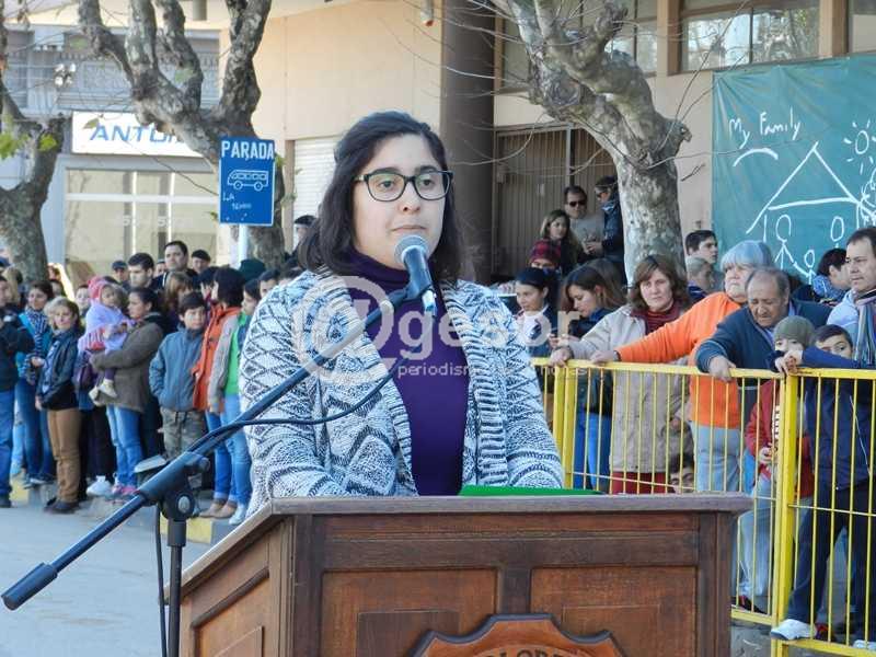 La Profesora Daniela Saravia fue la única oradora durante el acto celebratorio de la Jura de la Constitución que en esta ocasión se desarrolló en Dolores, frente a la plaza Constitución, en el marco del reconocimiento y agradecimiento a las instituciones y al pueblo mismo que está llevando adelante la reconstrucción de la ciudad tras el tornado del 15 de abril.