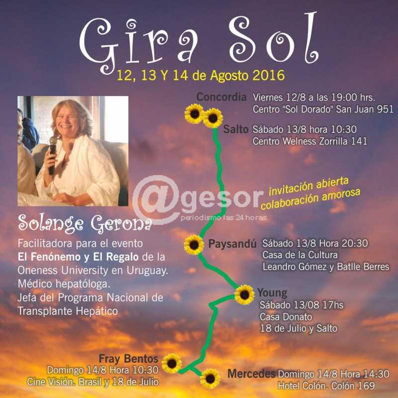 En su "Gira Sol", gira que abarca ciudades del litoral uruguayo-argentino, llega al Hotel Colón de Mercedes este domingo 14 de agosto a la hora 14.30 la Dra. Solange Gerona. Será una gran oportunidad para conversar cara a cara con una guía espiritual reconocida a nivel nacional e internacional. Médica especializada en trasplante hepático es la imagen de la Oneness University en nuestro país vinculada fuertemente a India y al camino espiritual conocido como Deeksha.