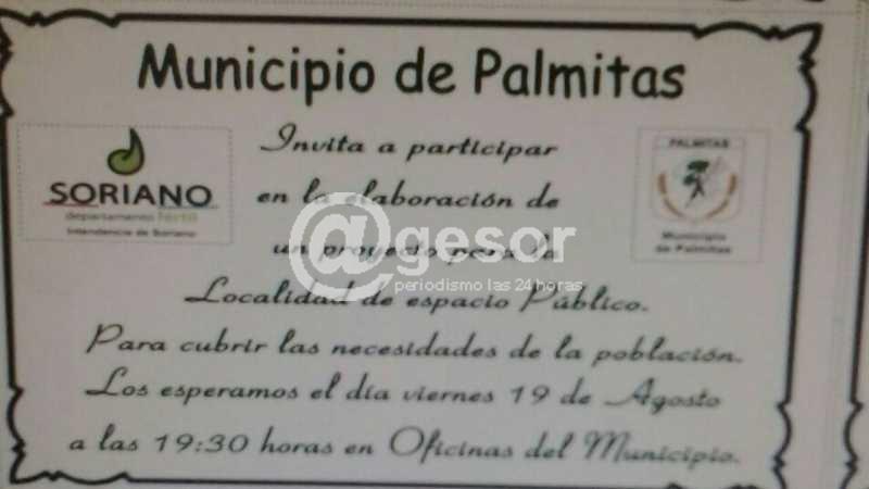 El Municipio de Palmitas convoca a una reunión pública para este viernes donde se presentarán las ideas para elaborar el proyecto para presentar ante la Oficina de Planeamiento y Presupuesto (OPP).