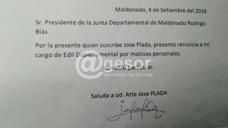 Paralelo a ello José Plada presentó una carta de renuncia ante el presidente de la Junta Departamental de Maldonado, aduciendo “motivos peronales".