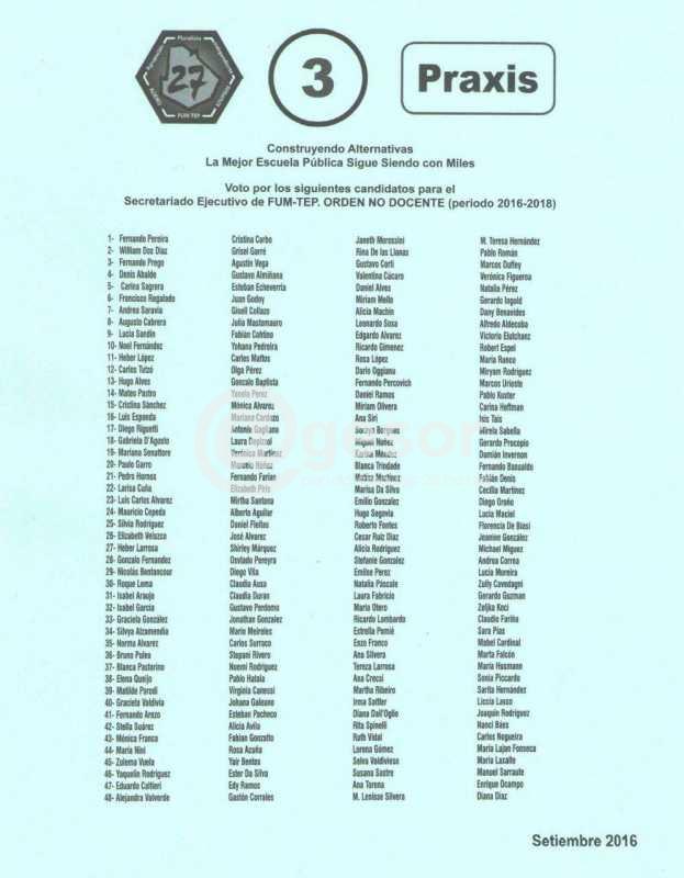 Como se apreciará, más allá de las aclaraciones que tú realizas, en la hoja de votación de color verde 27 - 3 Praxis, dice "Voto por los siguientes candidatos para el Secretariado Ejecutivo de FUM-TEP, Orden no docente (período 2016-2018)" y allí encabezando la lista con el 1 está Fernando Pereira.
