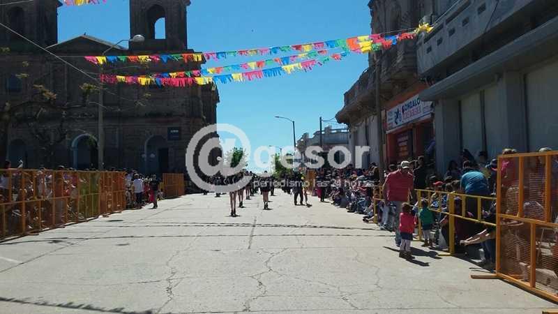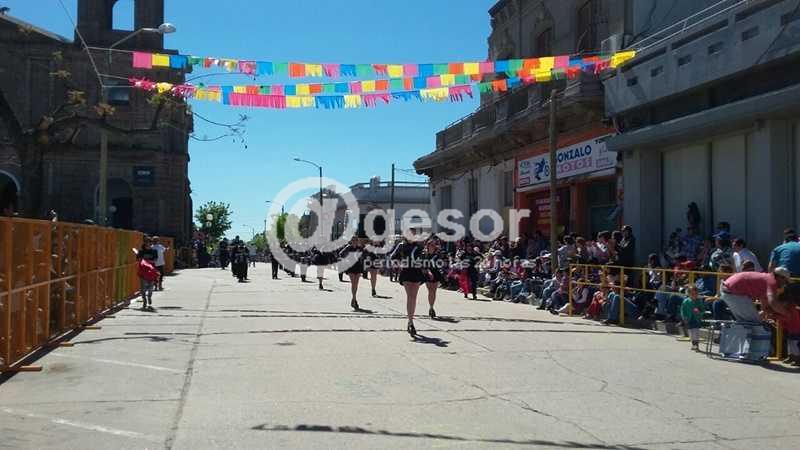 El desfile se realiza en su habitual recorrido pasando por el palco oficial ubicado frente a Plaza Constitución, junto al Liceo N° 1, uno de los edificios que resultó seriamente afectado por el tornado del 15 de abril pasado.