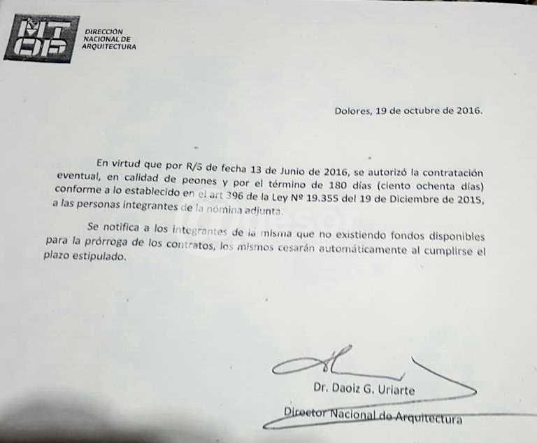 Sorpresivamente el Director Nacional de Arquitectura del Ministerio de Transporte y Obras Públicas, Dr. Daoiz Uriarte, comunicó que "en virtud que por R/5 de fecha 13 de junio de 2016, se autorizó la contratación eventual, en calidad de peones y por el término de 180 días conforme a lo establecido en el art. 396 de la Ley N° 19355 del 19 de diciembre de 2015, a las personas integrantes de la nómina adjunta.
