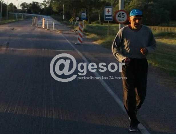 El maratonista llegó a Palmitas, donde descansa un poco, a fin de retomar su esfuerzo.
