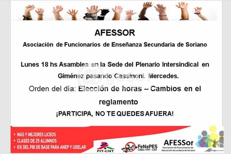 Lunes 18 hs Asamblea en la Sede del Plenario Intersindical en Giménez pasando Cassinoni. Mercedes.