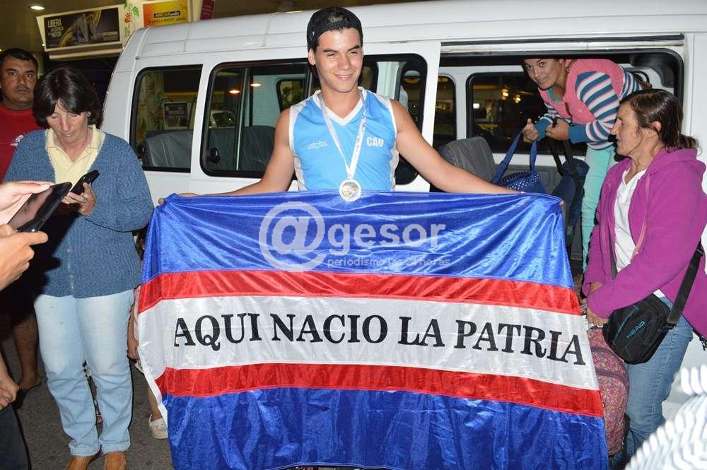 Los jóvenes atletas mercedarios fueron recibidos en la radial de la ruta 2 por un grupo de familiares, entrenadores, compañeros y público en general.