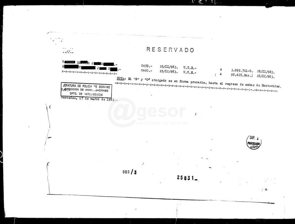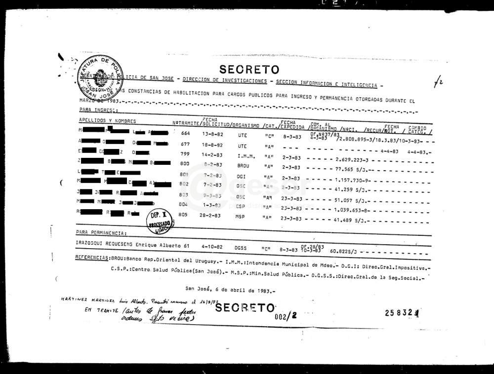 Documentos de la época revelan estos procedimientos que si bien no son una novedad corroboran lo que es parte del anecdotario popular. @gesor accedió a alguno de esos documentos militares que reflejan esa perversidad por espiarlo todo. Hechos que ocurrieron durante todo el período dictatorial. A modo de ejemplo el 4 de abril de 1983, el Coronel Nelson Rodríguez, Delegado departamental del SID (Servicio de Información de Defensa), informaba al general Germán de la Fuente sobre la “relación de Constancias de habilitación para cargos públicos, expedidos por esta agencia, durante el mes de febrero ppdo”. Detallando como lo reflejan las fotografías que acompañan esta nota, la nómina de mercedarios que habían iniciado trámites para ingresar a la UTE, OSE, Banco República. Optamos por proteger la identidad de estas personas pues este artículo pretende hacer foco en el espionaje sistemático a que eran sometidos los ciudadanos y no distraer la atención en otras cuestiones.