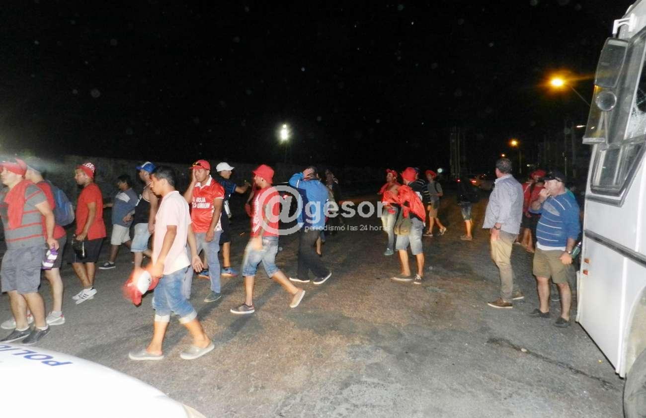 Primero se dio salida al ómnibus más afectado, allí debido a que varios de los hinchas estaban ebrios hubo algunas corridas y altercados con policías que trataban de hacerles entender que subieran al coche para ser escoltados y retirarlos hasta que lo lograron. El coche con sus choferes fue llevado a la seccional 2a. para realizar la denuncia correspondiente.