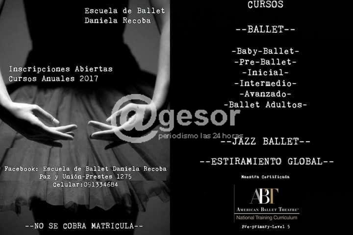 La Escuela de Ballet Daniela Recoba abre inscripciones a los cursos 2017. La escuela funciona actualmente en el Salón de Fiestas del Centro Recreativo Paz y Unión de la ciudad de Dolores, sobre calle Prestes 1275. Allí se brindan clases de Ballet (Baby-Ballet, Pre-Ballet, Inicial, Intermedio, Avanzado y Ballet Adultos), Ballet Jazz y Estiramiento Global, a partir de los 3 años y sin límite de edad, con y sin experiencia. Vale destacar que el curso de Estiramiento Global es un curso nuevo, dirigido al público en general, con la finalidad de crear conciencia de la importancia fundamental de la salud de nuestra columna vertebral, cuidando y fortaleciendo nuestra anatomía con ejercicios de bajo impacto.