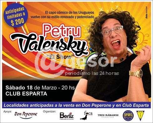 El actor y capo cómico Petru Valensky regresa a la ciudad de Mercedes con un espectáculo renovado, “El Show”. Valensky se presentará en el Club Atlético Esparta, este sábado 18 de marzo, desde las 20:00 horas. Las entradas anticipadas tienen un precio de $ 200 y pueden adquirirse tanto en la sede social de la institución organizadora como en el Restaurante Don Peperone.