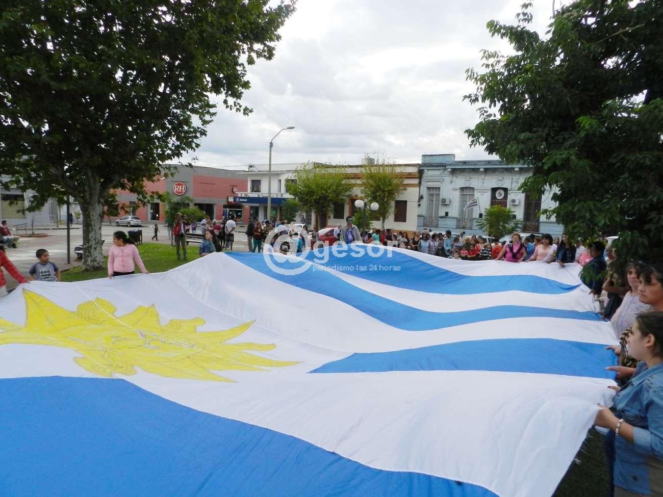 Dolores (enviado especial). Silka Romero (foto), junto a otras ciudadanas y niños, desplegaron una gran bandera uruguaya en plaza Constitución, tras el descubrimiento de placa en homenaje a las víctimas del tornado del 15 de abril 2016 en Dolores.