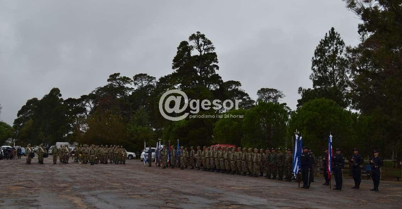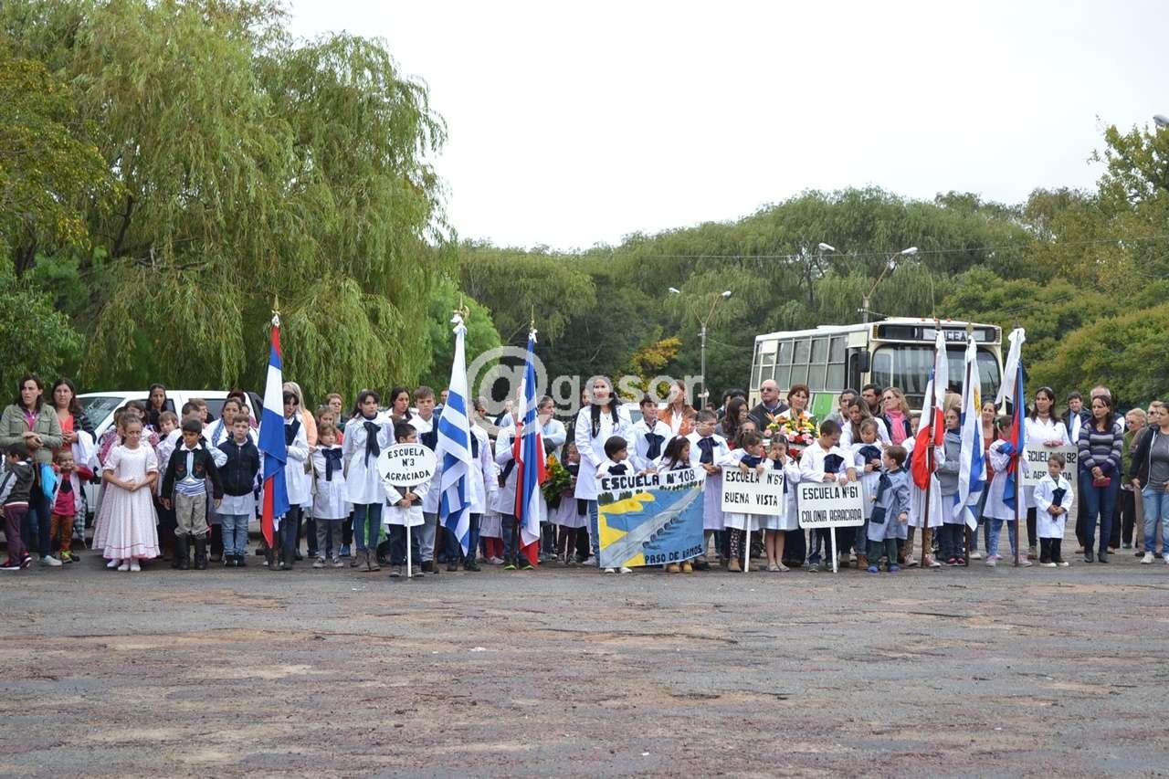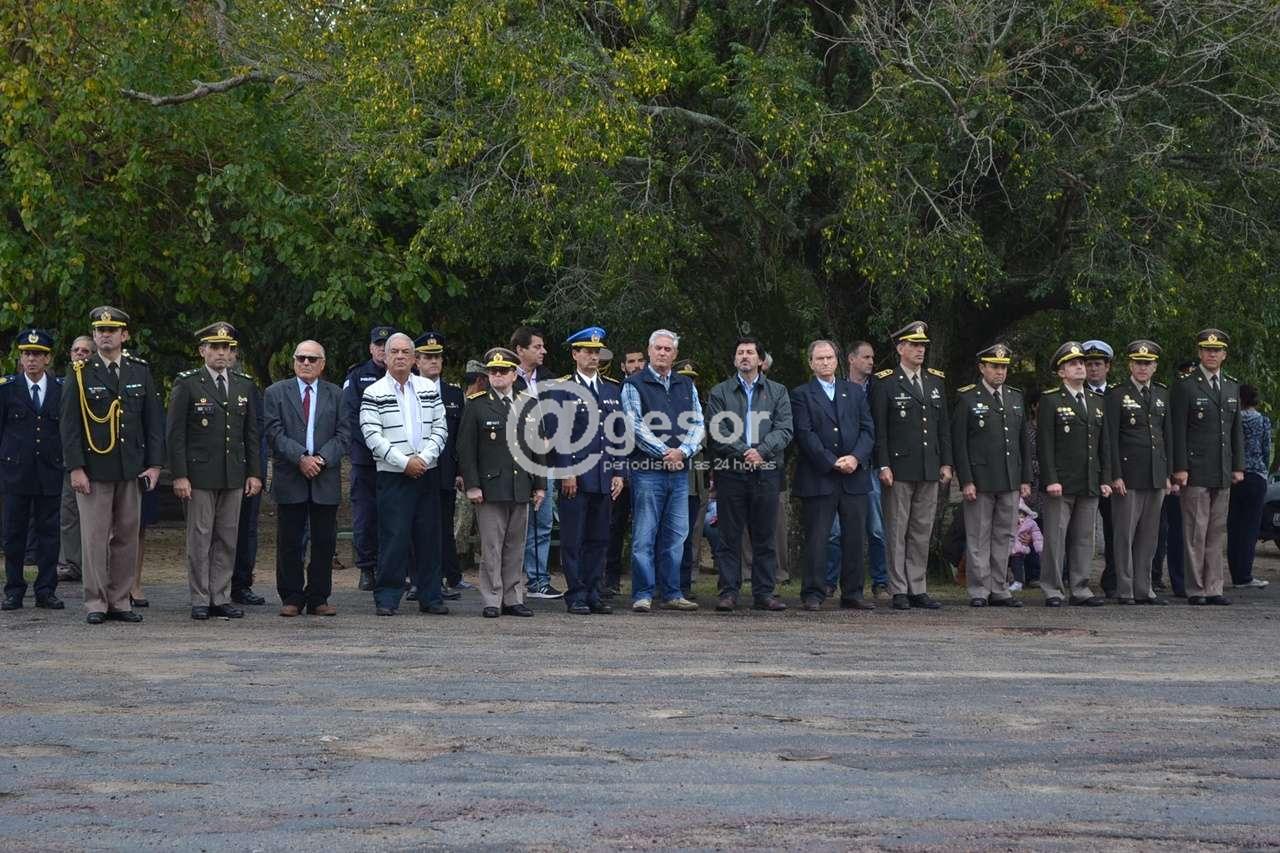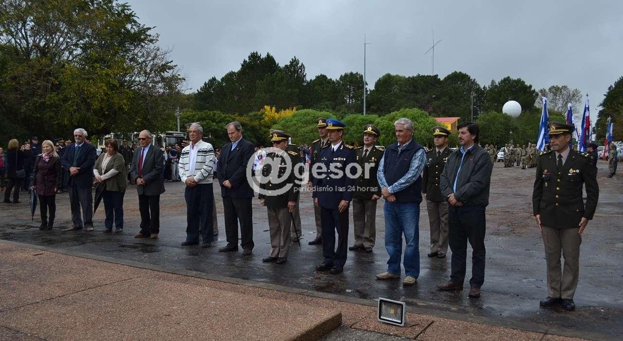 A pesar de la llovizna que por momentos se hacía presente, el acto comenzó puntualmente a las 15 hs. con la entonación del Himno Nacional ejecutado por la banda de la División de Ejército II, luego en la parte el Sub Jefe de Policía de Soriano, Comisario Mayor Leonardo Guardia hizo referencia al hecho histórico conmemorado y resaltó valores patrióticos que se ponen de manifiesto en la actualidad, especialmente ejemplificando con el accionar desplegado en apoyo a la población de dolores tras el tornado del año pasado.