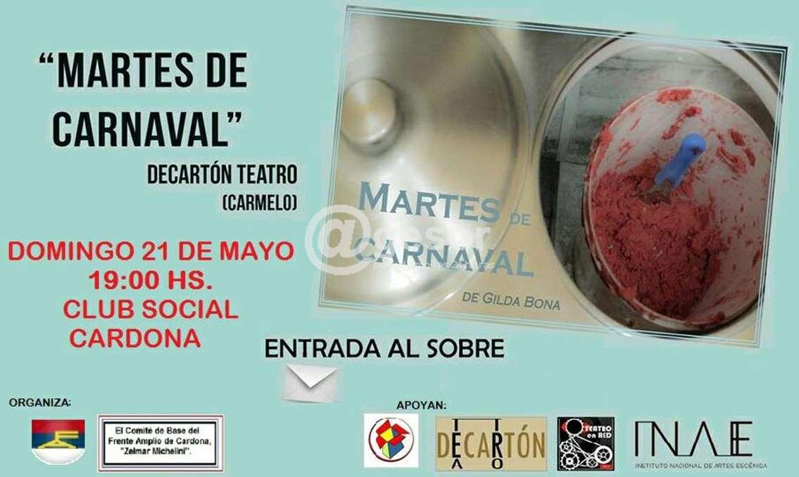 Este domingo 21  de  mayo el grupo “Decartón  Teatro”  presentará en  el Club Social Cardona  la  obra  “Martes de Carnaval”. Esta  actividad cultural es  organizada  por el Comité  del Frente  Amplio  de Cardona,  en   el  marco  de  un  nuevo aniversario  de la  muerte  de Zelmar Michelini.