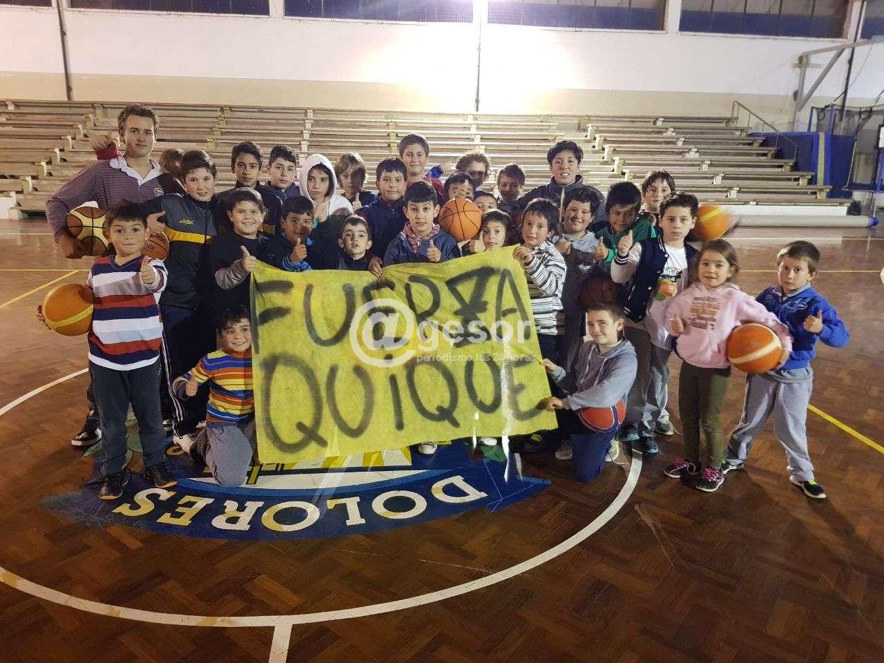 Integrantes de las formativas del Club de Peñarol de Básquetbol de Dolores, por iniciativa propia, confeccionaron una bandera con la leyenda “Fuerza Quique”, trasmitiendo así el deseo de pronta recuperación, de quien habitualmente informa sobre sus distintas actividades.