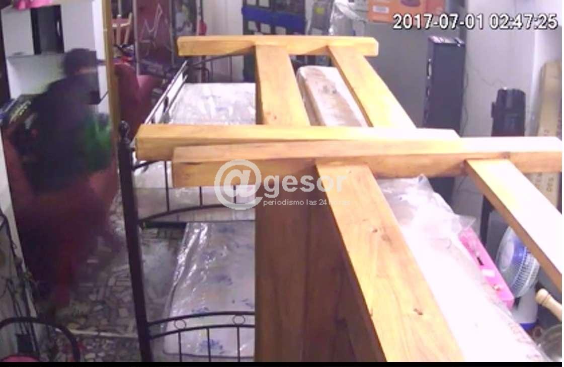 A partir de allí el o los ladrones deciden realizar un agujero en la protección externa de la ventana que da a calle Sánchez, a la vez que logran destrabar la ventana sin romper el vidrio. A pesar de lo chico del agujero, por allí ingresa un masculino de regular tamaño, llevando consigo una mochila de color verde. Cruza el local comercial internamente directo hacia donde se encuentra la caja que es de chapa, y con una tijera trata de abrirla, demorando algunos minutos dentro del local, llevándose alrededor de $ 10.000, los que se ve guardando en la mochila, cuando se retira del lugar, la cámara interior marca las 2 horas 47 minutos.