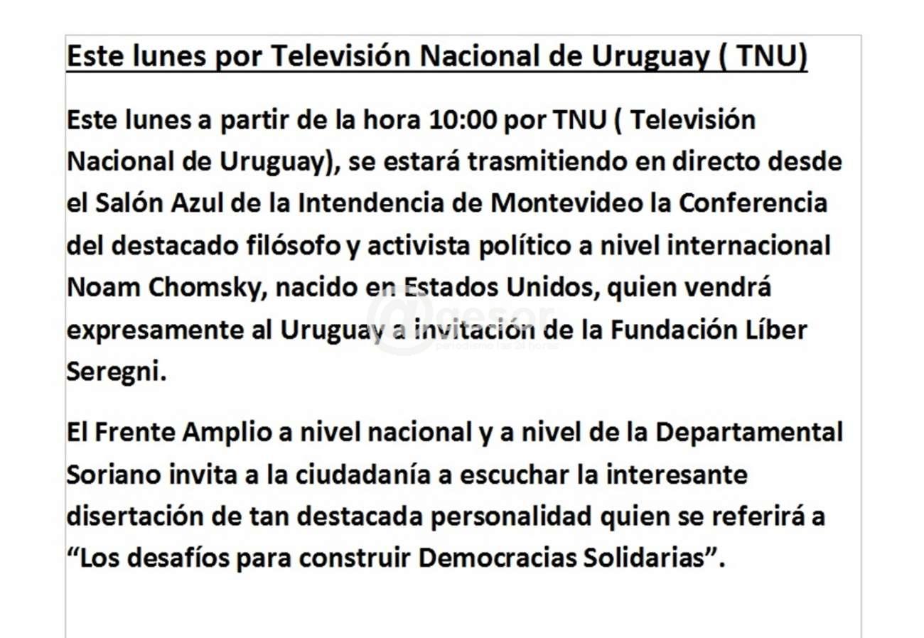 Este lunes a partir de la hora 10.00 por TNU (Televisión Nacional de Uruguay), se estará trasmitiendo en directo desde el Salón Azul de la Intendencia de Montevideo la Conferencia del destacado filósofo y activista político a nivel internacional Noam Chomsky, nacido en Estados Unidos, quien vendrá expresamente al Uruguay a invitación de la Fundación Líber Seregni.
