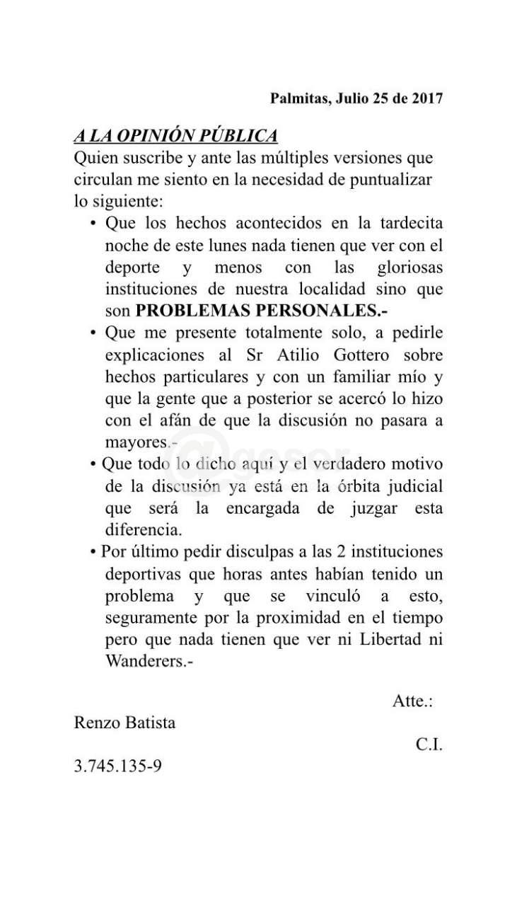 Renzo Batista, quien fue denunciado por el Presidente de Wanderers de Palmitas, Atilio Gottero, por haberlo agredido, emitió comunicado a la opinión pública tratando de deslindar el hecho de los incidentes ocurridos entre jugadores y parciales de Libertad y Wanderers el domingo al término del encuentro entre ambos equipos.