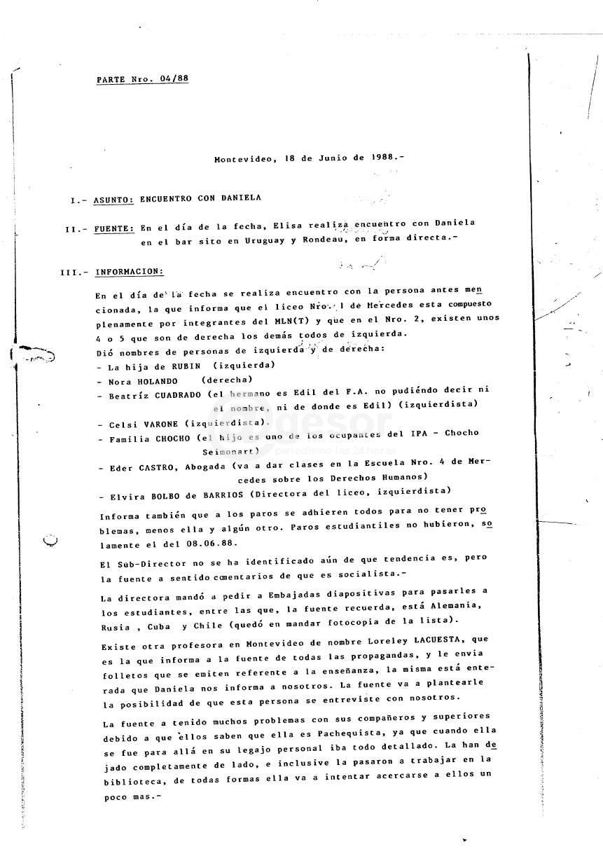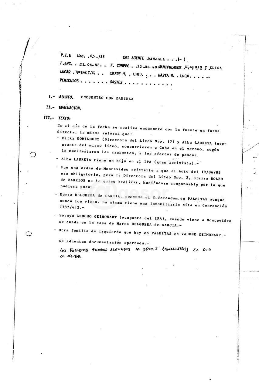 En el rollo 858 correspondiente al año 1988 aparece en escena la agente 02-G, Daniela, y sobre ella el informe establece: “Se toma contacto con la fuente telefónicamente en su lugar de trabajo (Liceo de Mercedes), mostrándose interesada en colaborar”. Se apunta allí el horario de trabajo de la informante y que “para verla tendría que ser, lunes, miércoles y viernes, antes de las 1230 o después de las 1830 hasta las 1850, que es cuando sale el último coche para Palmitas, que es donde vive (a 30 km. de Mercedes). Viaja todos los días. De lo contrario los días martes y jueves después de las 1030 hs. No piensa venir a Montevideo hasta los primeros días del mes de julio, aproximadamente”. Puntualizándose al final de este primer documento que para contactarla había que llamar de parte de Elisa al teléfono 0532 2136; o sea al Liceo N° 2 “Luis A. Zanzi”, que aún hoy mantiene el mismo número.