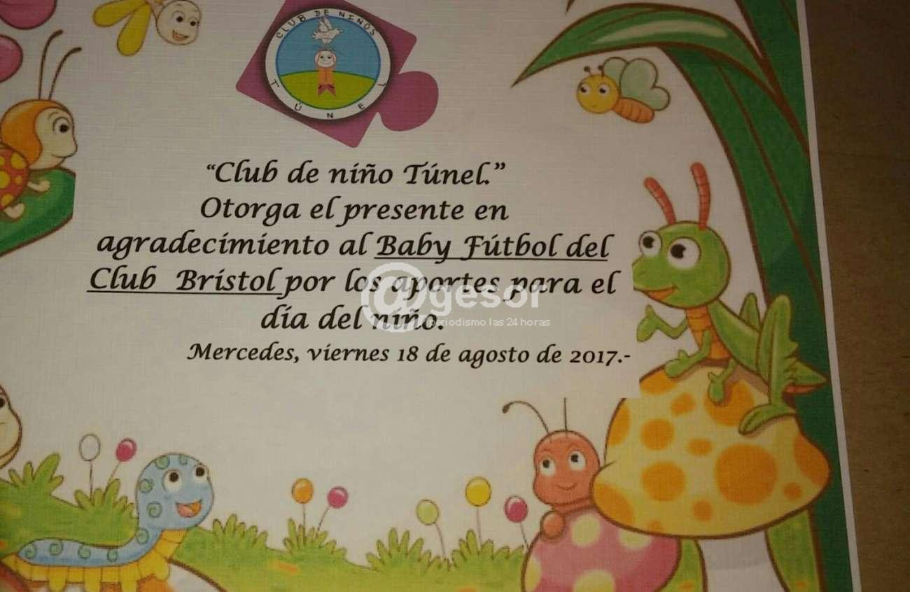 El club del niño Túnel a través de su coordinador Alfredo Rodríguez, agradeció por intermedio de @gesor al Baby Fútbol del club Bristol, por los aportes recibidos para el día del niño.