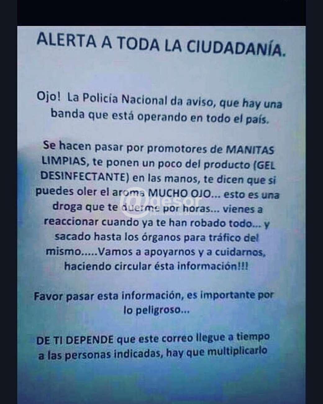 El mensaje expresa: “Ojo! La Policía Nacional da aviso, que hay una banda que está operando en todo el país. Se hacen pasar por promotores de MANITAS LIMPIAS, te ponen un poco del producto (GEL DESINFECTANTE) en las manos, te dicen que si puedes oler el aroma MUCHO OJO ... esto es una droga que te duerme por horas... vienes a reaccionar cuando ya te han robado todo… y sacado hasta los órganos para el tráfico del mismo….. Vamos a apoyarnos y a cuidarnos, haciendo circular esta información!!! Favor pasar esta información, es importante por lo peligroso... DE TI DEPENDE que este correo llegue a tiempo a las personas indicadas, hay que multiplicarlo".