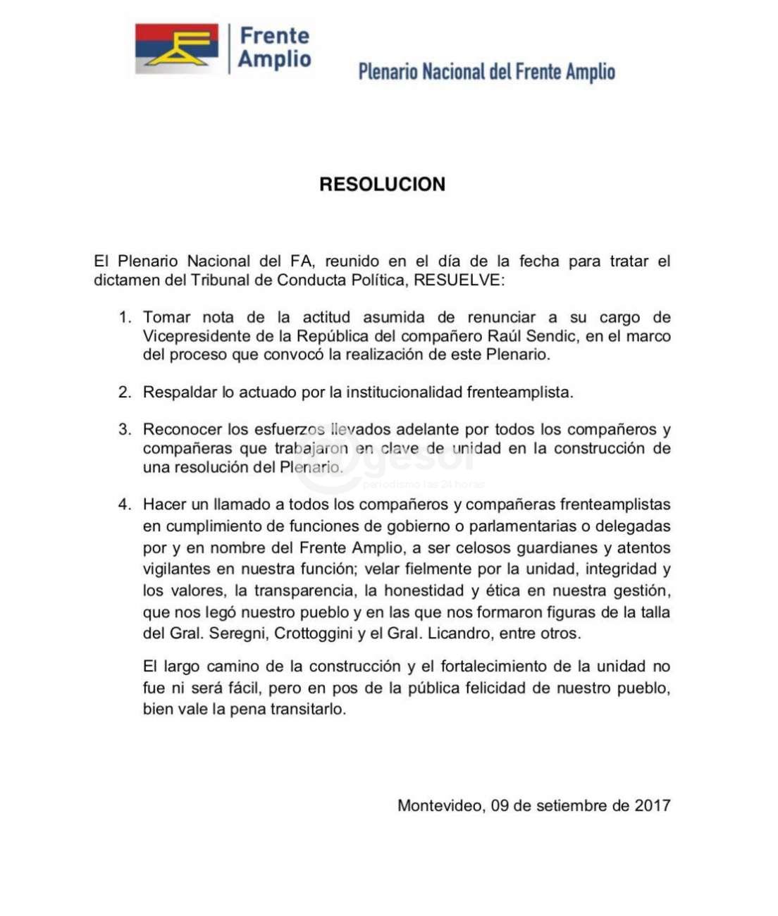 1. Tomar nota de la actitud asumida de renunciar a su cargo de Vicepresidente de la República del compañero Raúl Sendic, en el marco del proceso que convocó la realización de este Plenario.