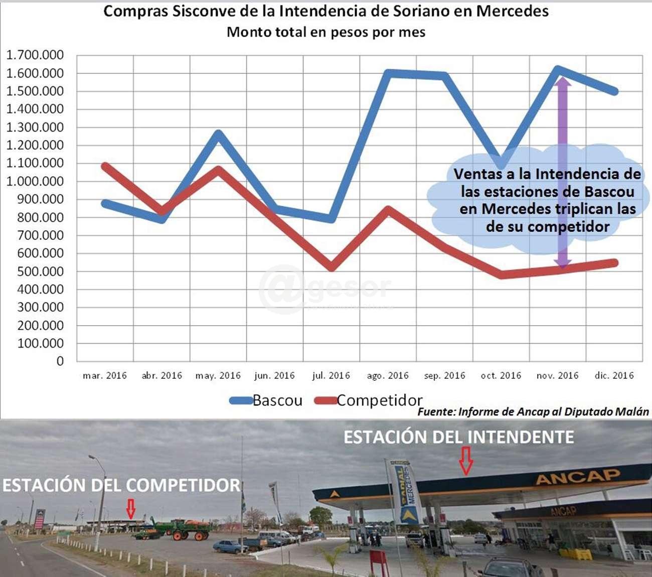 - Que a partir de febrero de 2016 se activa el sistema Sisconve en la estación de servicio de Mercedes ubicada en ruta 2 y administrada por el Sr. Intendente. Según lo informado por ANCAP al Representante Nacional del departamento Mtro. Enzo Malán según su solicitud del 13/9/2016, se pudo detectar que mientras en los primeros meses de operación las ventas a la Intendencia se repartían equitativamente entre los dos distribuidores de la capital departamental, hacia el fin de 2016 las ventas a la Intendencia de las estaciones del Sr. Bascou triplicaban las de su competidor en la ciudad. Este se ubica a menos de cien metros de una de las estaciones del Sr. Intendente.