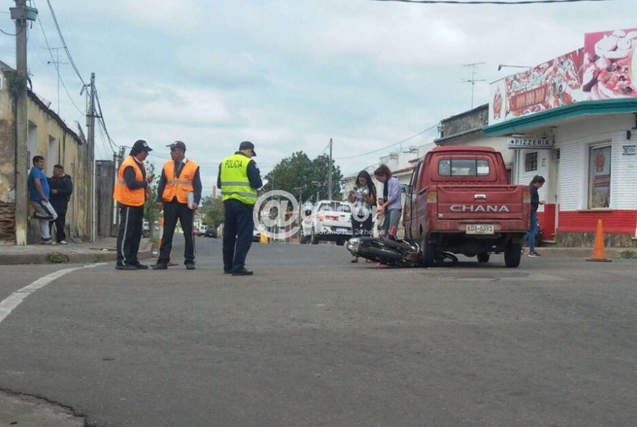 Minutos antes de mediodía se produjo colisión en la intersección de avda. Fregeiro e Ituzaingó, cuando por la primera de las arterias circulaba de Este a Oeste la moto Yumbo 50 cc matrícula KNI 845 guiada por una adolescente, mientras que por Ituzaingó lo hacía de Norte a Sur el utilitario Chaná KDA 6391.