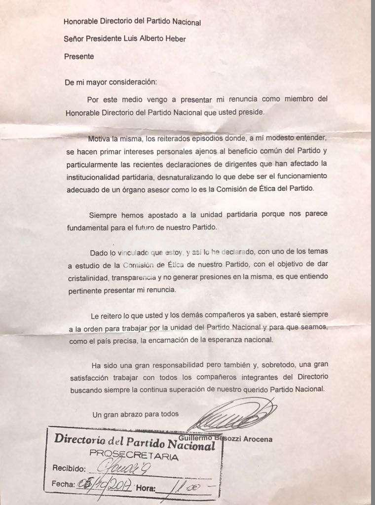 A las 11.00 horas de este jueves presentó renuncia al Directorio del Partido Nacional el Senador Guillermo Besozzi Arocena tras los hechos de notoriedad pública que hemos venido informando en @gesor.