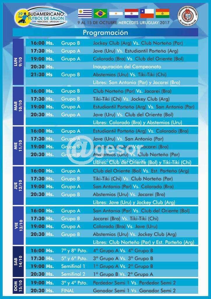 La programación de la jornada inaugural de este lunes 9 en el estadio "Alberto Della Santa", establece a partir de la hora 16.00. Jockey Club (Argentina) - Club Norteño (Paraguay), 17.30 Jave (Uruguay) - Estudiantil Porteño (Argentina), 19.00 horas Colorado (Brasil) - Club del Oriente (Bolivia), hora 20.30 será la inauguración oficial del Campeonato y a las 21.30 Los Abstemios (Uruguay) - Tiki Tiki (Chile).