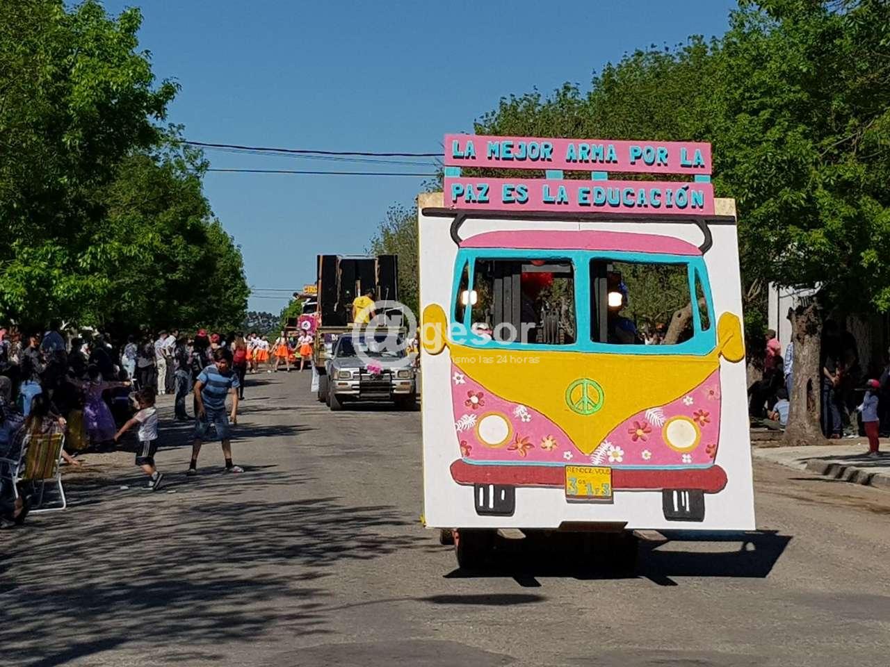 Carroza Nº 5, de 3º1 y 3º3 “La mejor arma para la paz es la educación”. Mensaje: “Un ser humano preparado, será capaz de edificar un mundo de paz. La educación nos marca el camino. Digamos no a las guerras, las bombas, los misiles, paremos la destrucción de nuestro planeta, sembremos árboles y flores, dejemos que el sol y la lluvia siga llenando nuestra tierra de primavera. Por eso hoy, los invitamos a continuar, lean, piensen, construyan, reciclen, ayuden, tiendan sus manos y juntos construiremos el mundo que soñamos.”