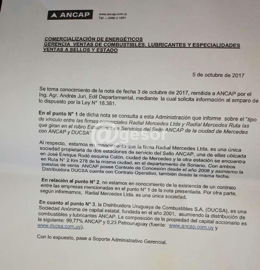 En la respuesta se establece: "En el punto N° 1 de dicha nota se consulta a esta Administración que informe sobre "el tipo de vínculo entre las firmas comerciales Radial Mercedes Ltda. y Radial Mercedes Ruta las que giran en el rubro estaciones de servicio del sello ANCAP de la ciudad de Mercedes con ANCAP y DUCSA".