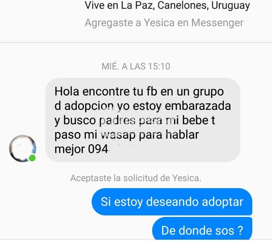 Eran las 15.10 horas de este miércoles cuando Beatriz, que vive en ejidos de Mercedes, recibió a través de su cuenta de facebook este mensaje: "Hola encontré tu fb en un grupo d adopcion yo estoy embarazada y busco padres para mi bebe t paso mi wasap para hablar mejor 094......".