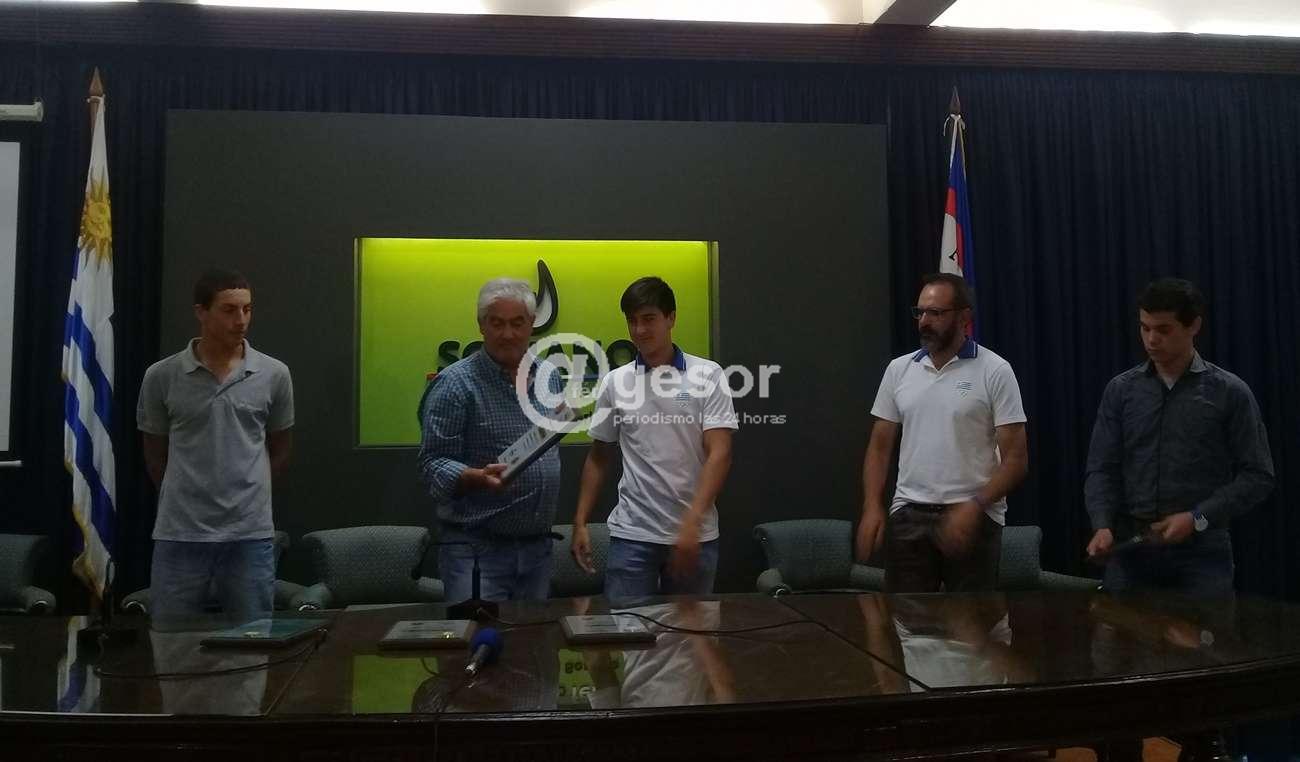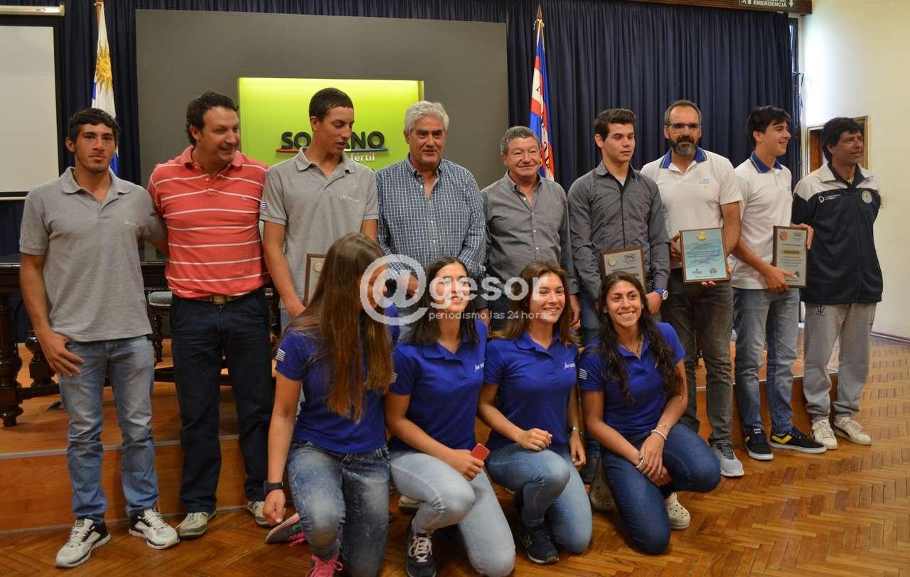 Los homenajeados son: Dahiana López, medalla de oro (lanzamiento de disco) que no pudo estar presente; Lautaro Techera, medalla de plata (lanzamiento de jabalina); Felipe Kluver, medalla de plata (remo) y Diego Ávila, medalla de bronce (canotaje) en los Juegos Sudamericanos de la Juventud realizados en Santiago de Chile. Junto a ellos el Prof. Richard Puig y el entrenador de remo Marcelo Trigo.