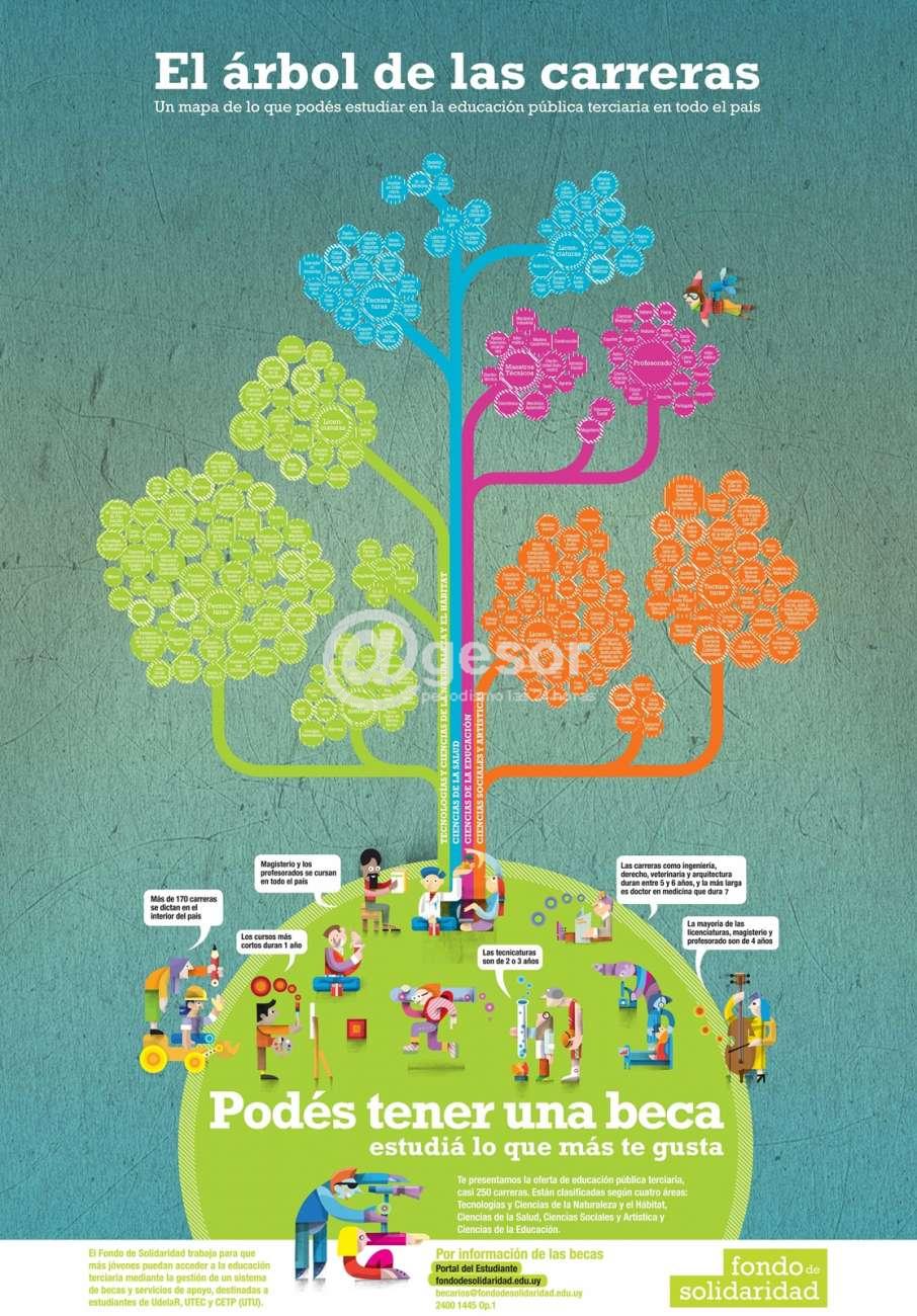A través del árbol de las carreras, el Fondo de Solidaridad presenta un mapa completo y actualizado de la oferta educativa pública, con todas las carreras terciarias que se pueden estudiar en la Universidad de la República (UdelaR), el Consejo de Educación Técnico Profesional (CETP- UTU) y la Universidad Tecnológica (UTEC).