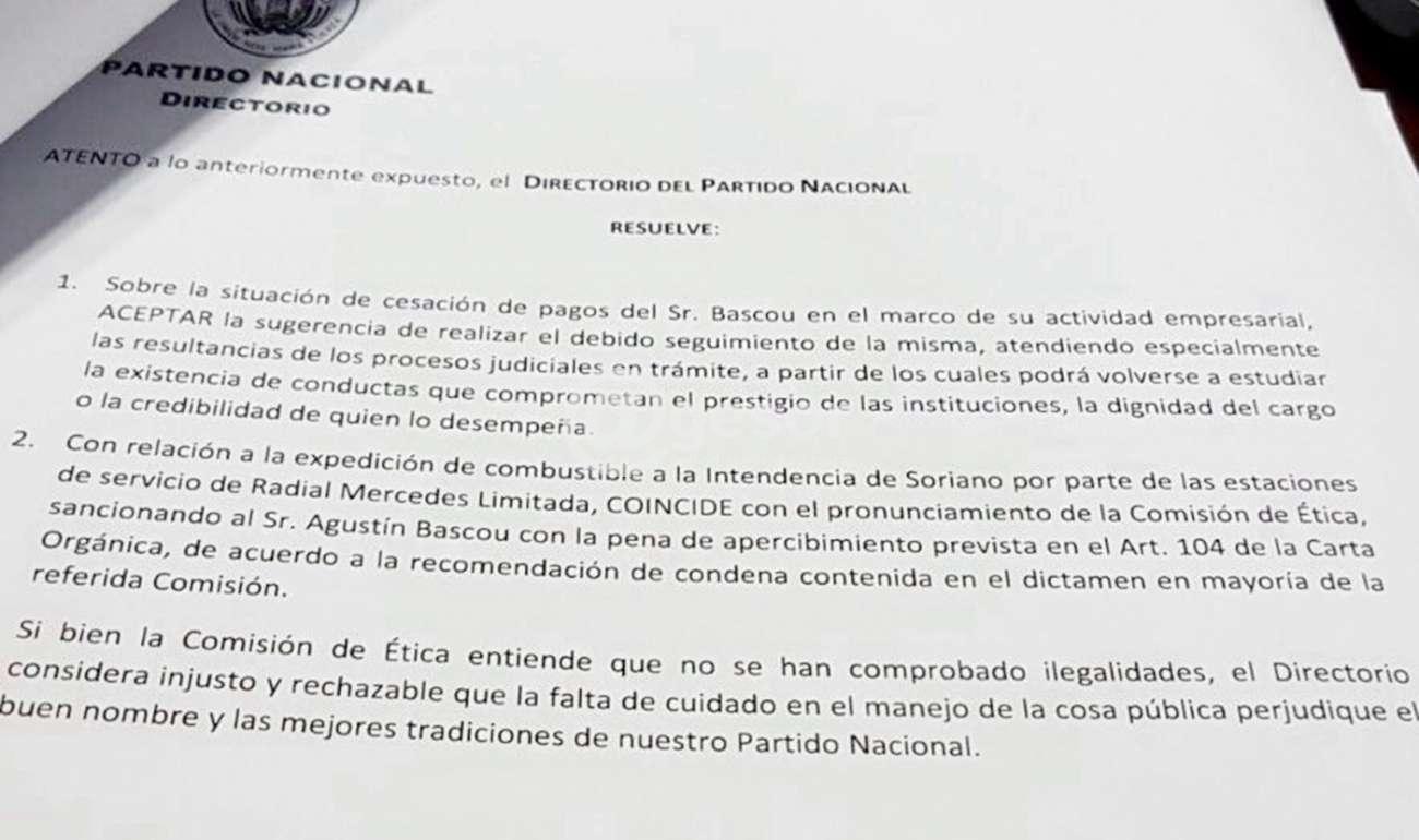 Este lunes se reunió el Directorio del Partido Nacional ocasión en la que consideró el informe de la Comisión de Etica sobre las actuaciones referentes al Intendente de Soriano, Agustín Bascou Gil, a quien finalmente resolvió apercibir por sus acciones. El texto de la resolución establece: