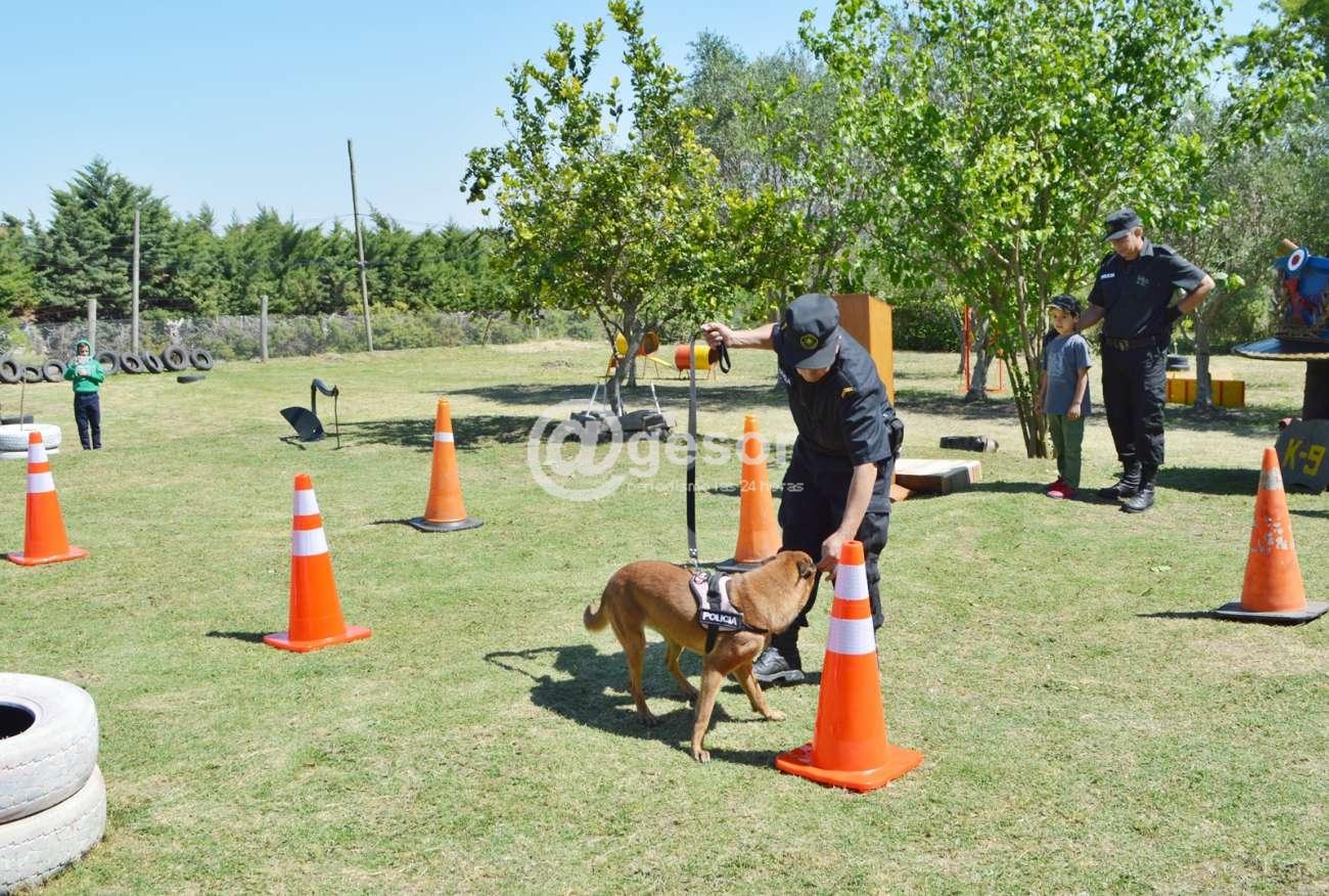 En el primer ejercicio, se presentaron dos canes que se encuentran capacitados para trabjos de seguridad. La Jefatura cuenta con dos perros, raza Ovejero Alemán (Donna y Flaca), la can Donna efectuó una demostración de "Agility", que consiste en sortear obstáculos haciéndolo con destreza y agilidad, como se pudo apreciar también su obediencia trabajando suelta sin correa y la can Flaca, es una perra capacitada para trabajos en caso que se generen disturbios, manifestaciones que alteren el orden público facilitando la disipación de los manifestantes. Son canes de intervención. Se presentaron los dos canes y a continuación se trabajó con obstáculos.