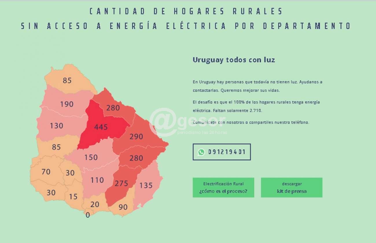 “En Uruguay hay personas que todavía no tienen luz. Ayudanos a contactarlas. Queremos mejorar sus vidas”,  expresa  el  comunicado  emitido  por la Oficina de Planeamiento  y Presupuesto. “ El desafío es que el 100% de los hogares rurales tenga energía eléctrica. Faltan solamente 2.710. Comunicate con nosotros o pasales nuestro WhatsApp: 091219401. Este Programa está impulsado por la Comisión Interinstitucional de Electrificación Rural (CIER). La CIER está integrada por: OPP, MGAP, MIDES, MIEM, MVOTMA, UTE, ANTEL, INC y MEVIR”.
