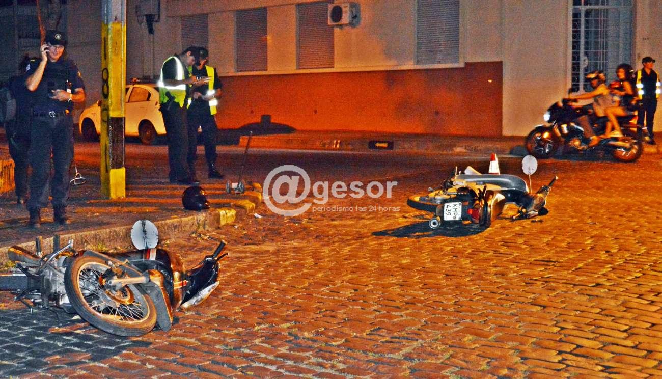 Un siniestro de tránsito entre dos motos se registró en la noche de este viernes en la intersección de calles Artigas y Ferrería que dejó como resultado dos personas lesionadas, una de ellas mayor de edad y otra menor, ambas derivadas a mutualista de la ciudad.