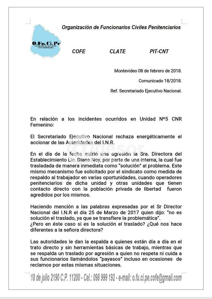 El sindicato de operadores penitenciarios del INR hizo llegar a @gesor declaración ante situación ocurrida en la Unidad N° 5, la que damos a conocer: