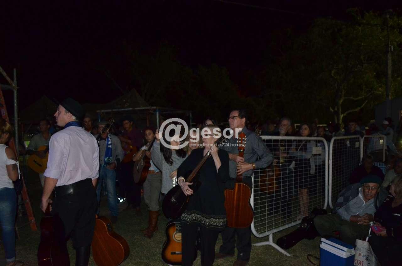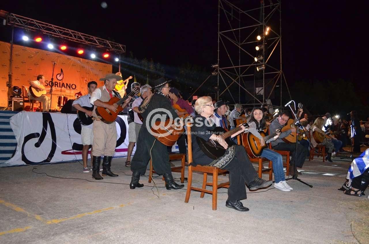 (@gesor en Villa Soriano) Cerca de 60 guitarras sonaron al unísono para cantar ‘A Don José’ en la milonga más grande del mundo. Como adelantáramos el desafío lanzado por Osvaldo Lagos prendió, primero en las redes sociales y después en el compromiso de numerosos guitarristas, profesionales y aficionados, que llegaron a Villa Soriano con su instrumento para tocar “A Don José”. Con el marco del 16° Festival Grito de Asencio la oportunidad fue propicia para concretarlo. Debajo del escenario los guitarristas se formaron y tocaron. Algunos con sus guitarras amplificadas por micrófonos, la mayoría sin amplificar pero con el mismo entusiasmo de participar del desafío. Algo que seguramente quedará en el recuerdo y la emoción de todos los que participaron, como músicos o como público, que terminó cantando la popular canción a viva voz.