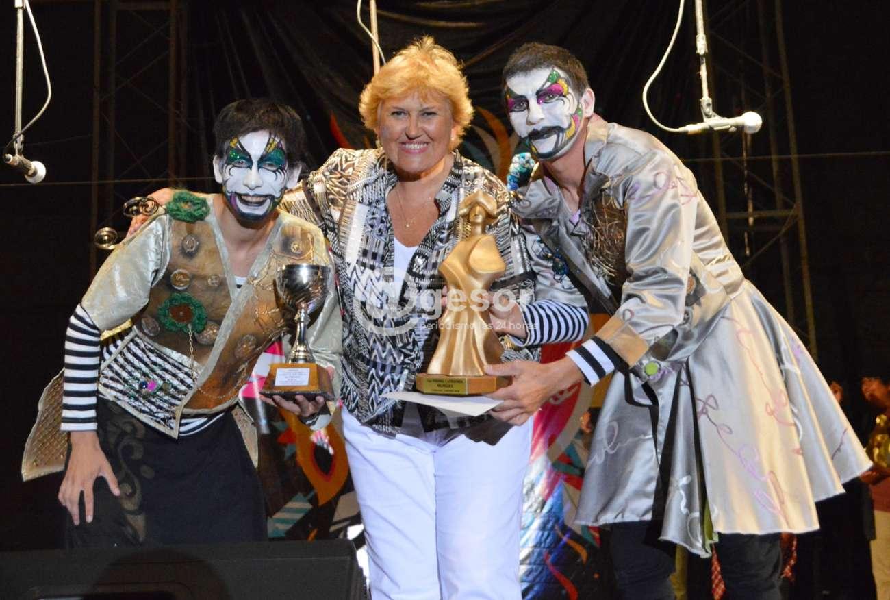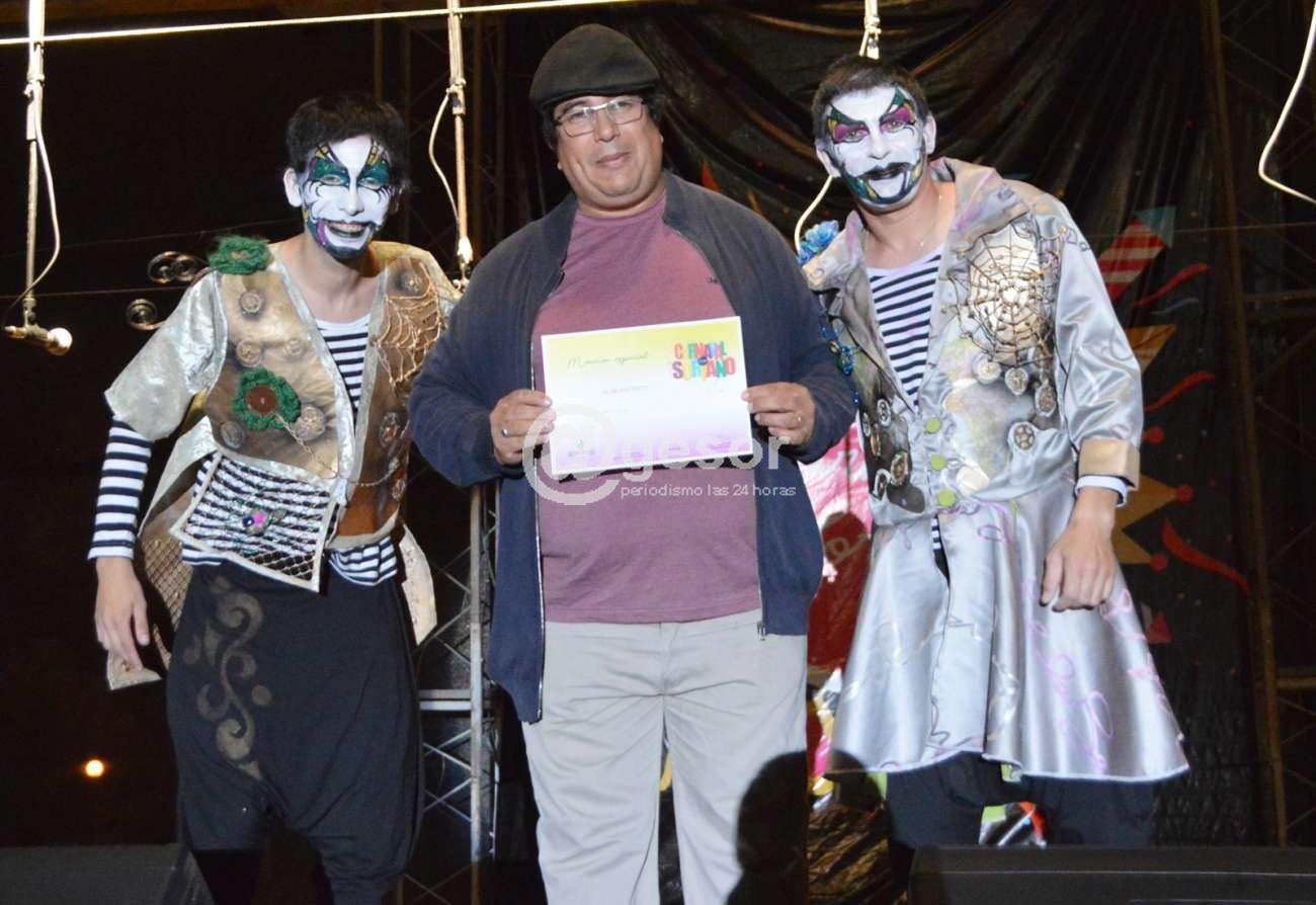 4- José María Bertullo recibe trofeo de manos de Olga Galeano y Julio Pozzolo Galeano, esposa e hijo de Titonga Pozzolo, como mejor texto del Carnaval
