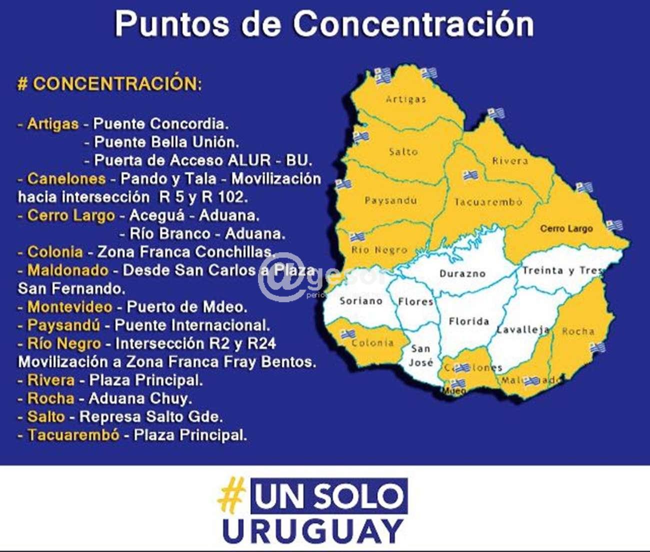 Soriano es uno de los pocos departamentos que no habrá movilización del movimiento “Un solo Uruguay” . Como se anunció las concentraciones en terminales portuarias, zonas francas, o en los accesos a centro poblados, se realizarán este miércoles en gran parte del país, como lo grafica la imagen que acompaña esta nota.