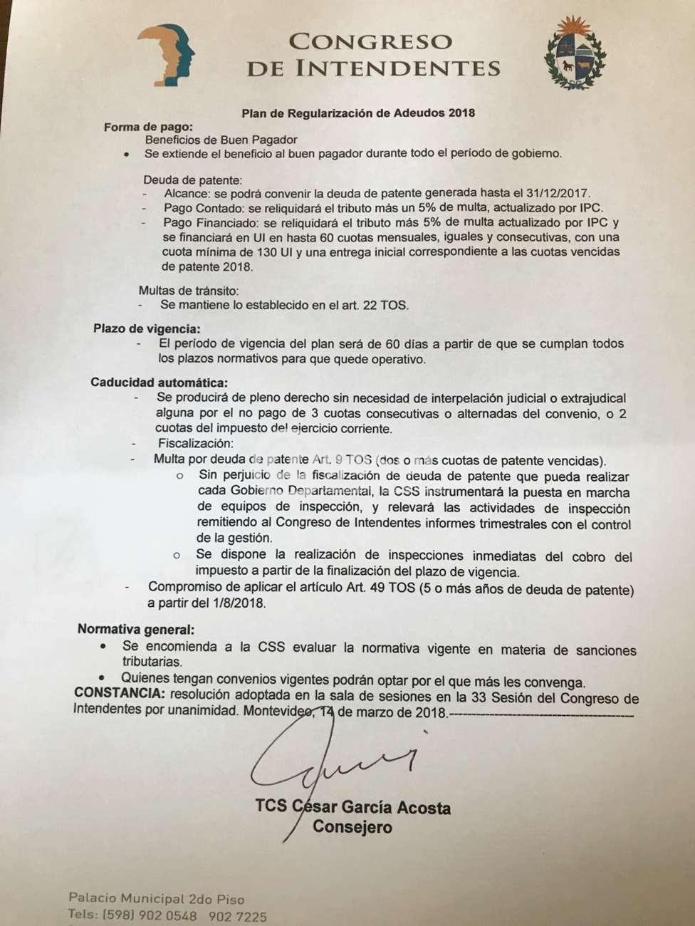 Ofrecemos el texto aprobado por el Congreso de Intendentes del Plan de Regularización de Adeudos en Patente de Rodados
