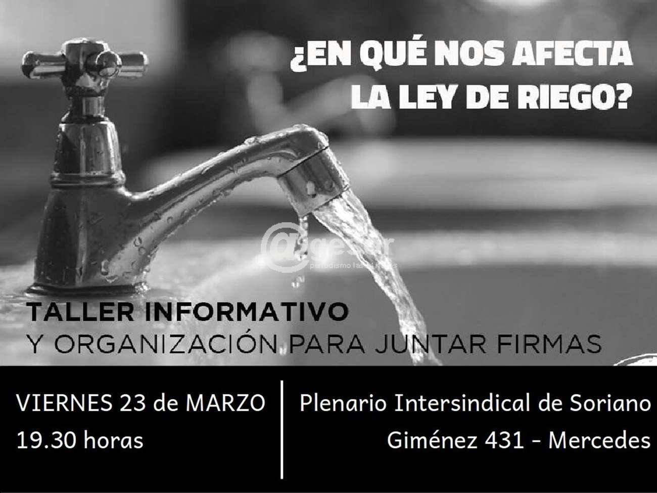 El vienes 23 de marzo a las 19,30hs. se realizará un taller informativo y organización para juntar firmas contra la Ley de riego. Dicho taller se denomina “¿En qué nos afecta la Ley de riego?”, siendo impulsado por el Plenario Intersindical de Soriano.