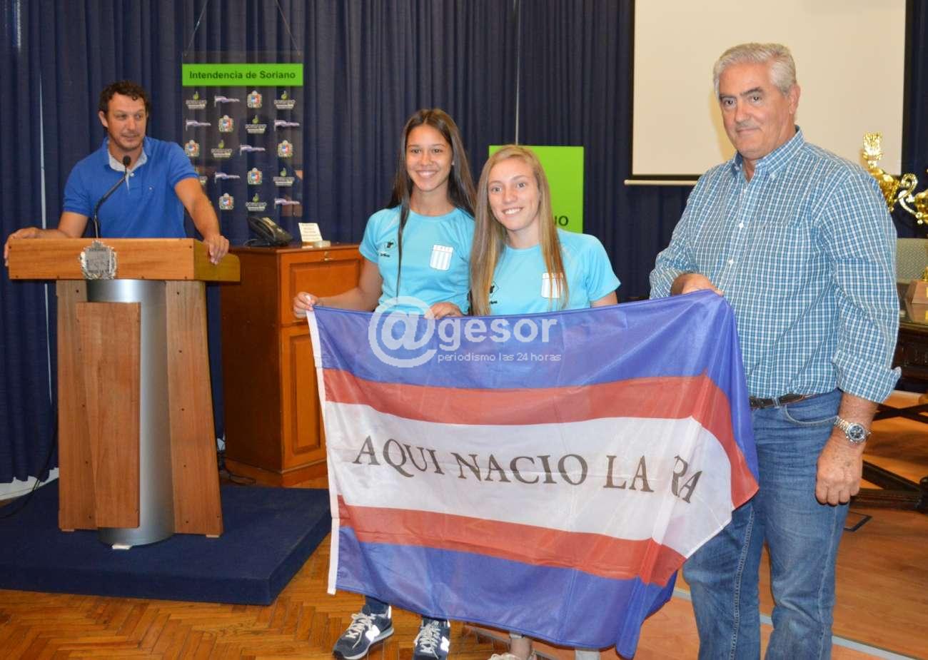 En el salón de actos de la Intendencia de Soriano, se realizó reconocimiento a Lusmila Giménez y Nicole Callorda, dos adolescentes mercedarias, sobre quienes el Prof. Rodrigo Eugüi Director de Deportes señaló, "son futbolistas, de muy buena calidad, que hace mucho tiempo juegan fútbol femenino, lo hacen en el Club Palmirense de Nueva Palmira, porque está dentro de Soriano Interior, hay una Liga muy fuerte a nivel femenino. Estas dos chicas van a viajar a Paraguay a jugar el Sudamericano de Clubes con Palmirense. El año pasado se hizo una Liga Femenina a nivel local, pero el fuerte está cerca de Nueva Palmira, por suerte en Mercedes se ha comenzado a fortalecer al fútbol femenino y en breve seguramente las tendremos para que nos deleiten con sus habilidades por aquí en las canchas de Mercedes".