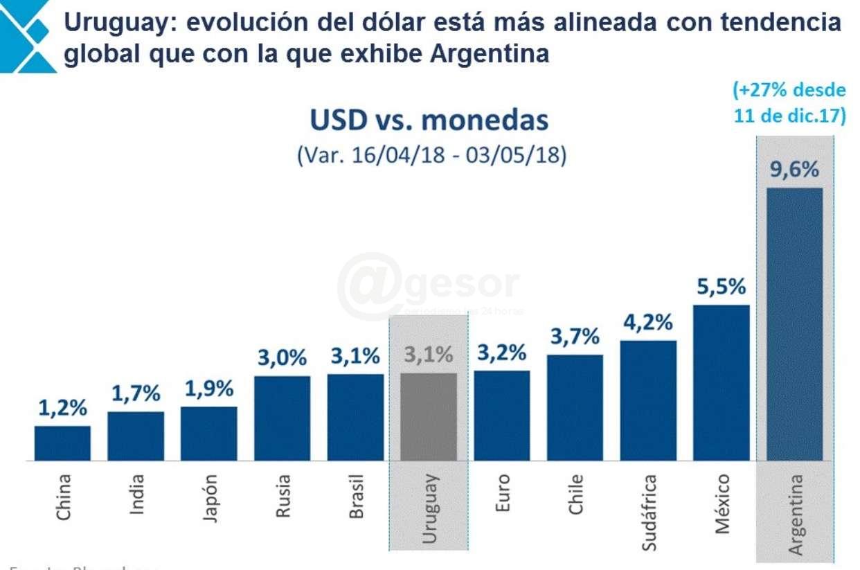 Y explicó “lo que hay que ver es que desde esa fecha hasta lo que va de mayo, generó un incremento del 3,1 %, en nuestro país, en Brasil un 3,1 % también, en Chile un 3,7%, eso en Sudamérica. China un 1,2%, en Europa el Euro un 3,2%, Sudáfrica un 4,2%, en México un 5,5%, y en Argentina un 9,6%”.